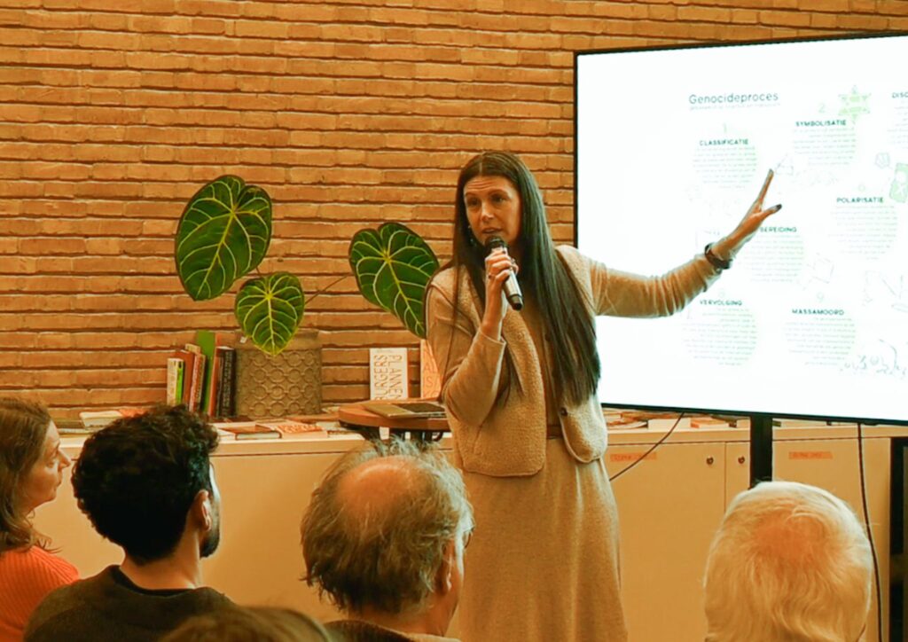 Tijdens deze avond werd genocide belicht vanuit drie perspectieven: wetenschap, praktijk en persoonlijke ervaring. Alma Mustafić, docent-onderzoeker aan de Hogeschool Utrecht, legde de 11 stappen van het genocideproces uit. Dit maakte zichtbaar hoe genocide geen plotselinge gebeurtenis is, maar het resultaat van een systematisch en herkenbaar patroon.